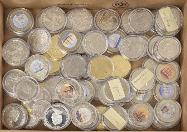 Alle Welt Umfangreicher Posten Numisnautik in überwiegend Kupfernickel, Schiffsmotive aus aller Welt, dabei diverse Serien, darunter Great Explorers of the Pacific, Fiji 2009, hervorzuheben außerdem 2 Exemplare 1 Dollar Cook Islands 2005, auf den 200. Jahrestag der Schlacht von Trafalgar, unterschiedliche Erhaltungen