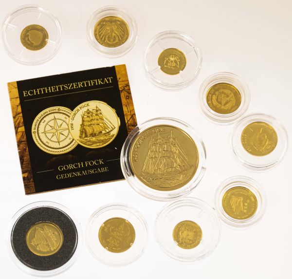 Alle Welt Goldmünzen mit maritimem Bezug, 6x 1/25 Unze fein, 3x 1g fein, dazu außerdem Gedenkausgabe Gorch Fock mit 1/10 oz 333er, jeweils gekapselt, unterschiedliche Qualitäten