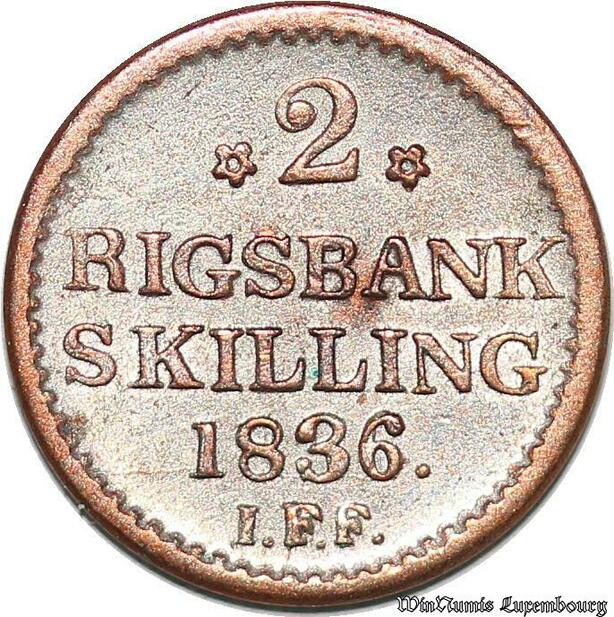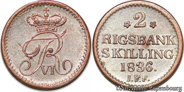 S7178 Denmark Danemark 2 Rigsbank skilling 1836 Frederik VI Quality AU !