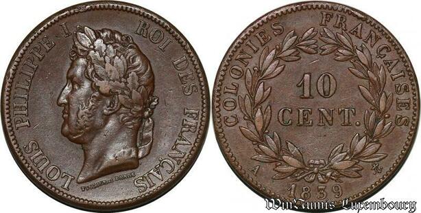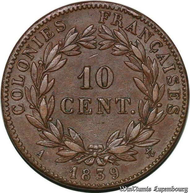 S7215 French Colonial Guadeloupe 10 Centimes 1839 AU ! Red Surfaces