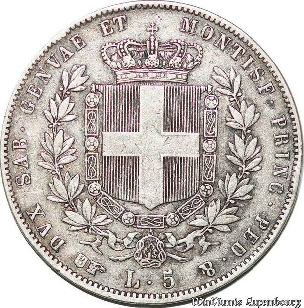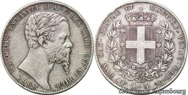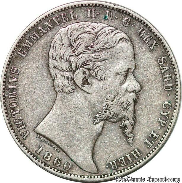 S7625 Très Rare Italian States Sardinia 5 Lire 1860 B Fearis Silver