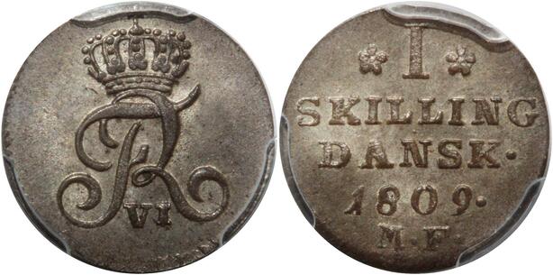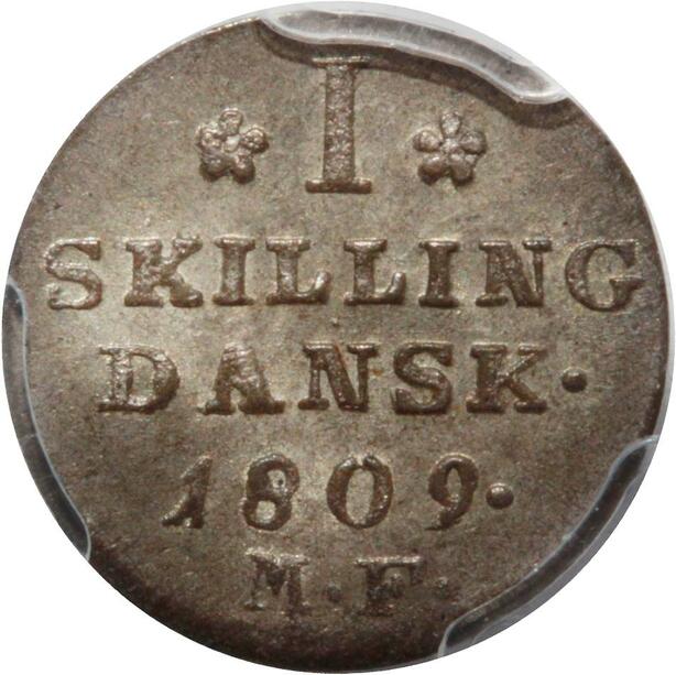 S7671 Rare Denmark 1 Skilling Rigsmønt 1809 MF Silver PCGS MS64 ->Make offer