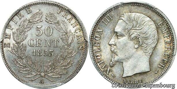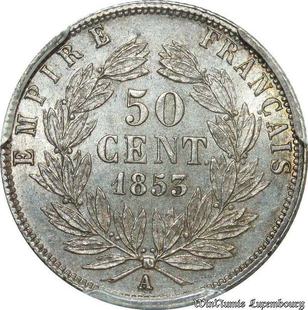 S7897 Rarissime 50 Centimes Napoléon I 1853 A Paris PCGS MS62 Argent SPL