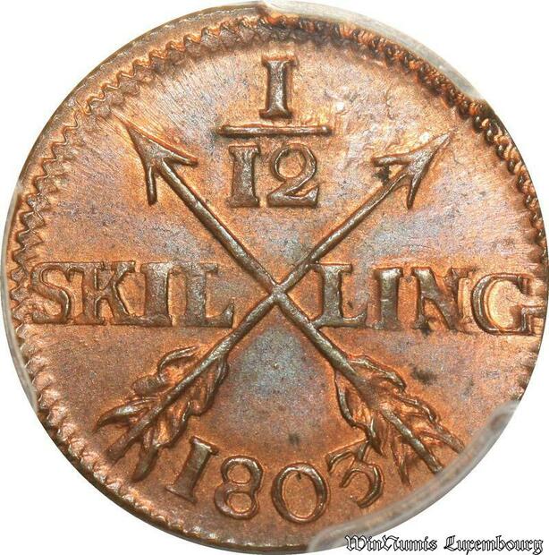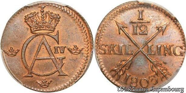 S7939 Suède Sweden 1/12 Skilling Gustaf IV Adolf 1803 PCGS MS64 FDC
