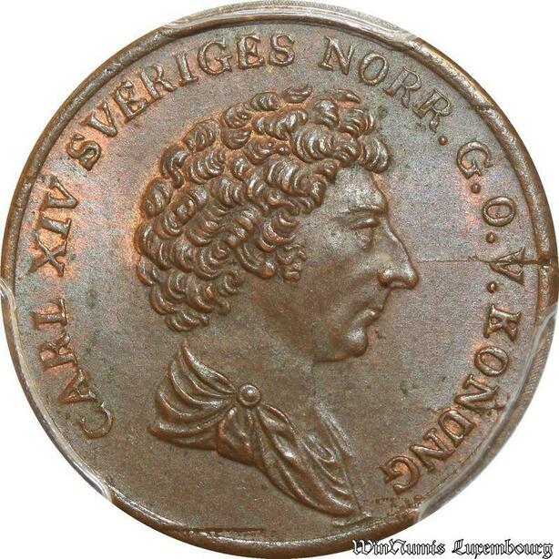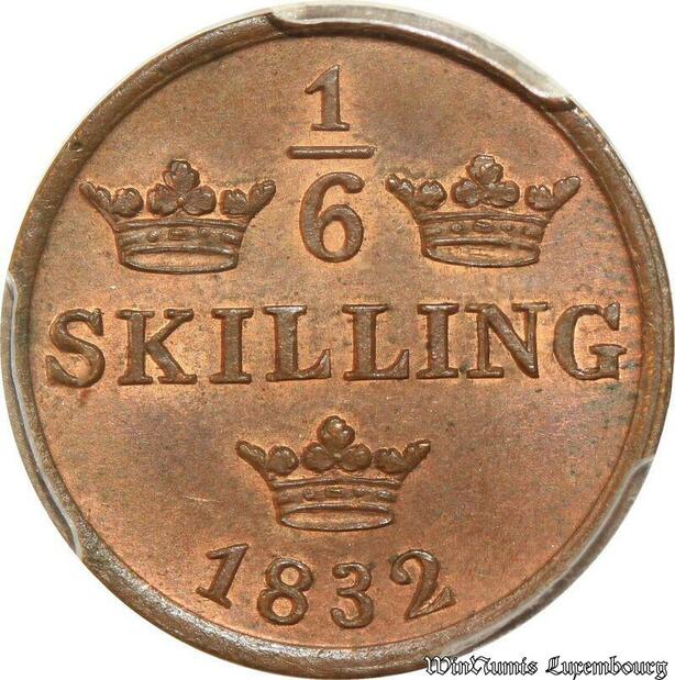 S7941 Finest Rare Suède Sweden 1/6 Skilling 1832 PCGS MS65BN Cuivre