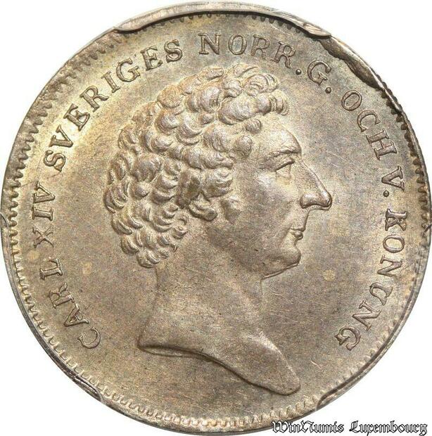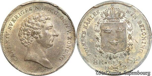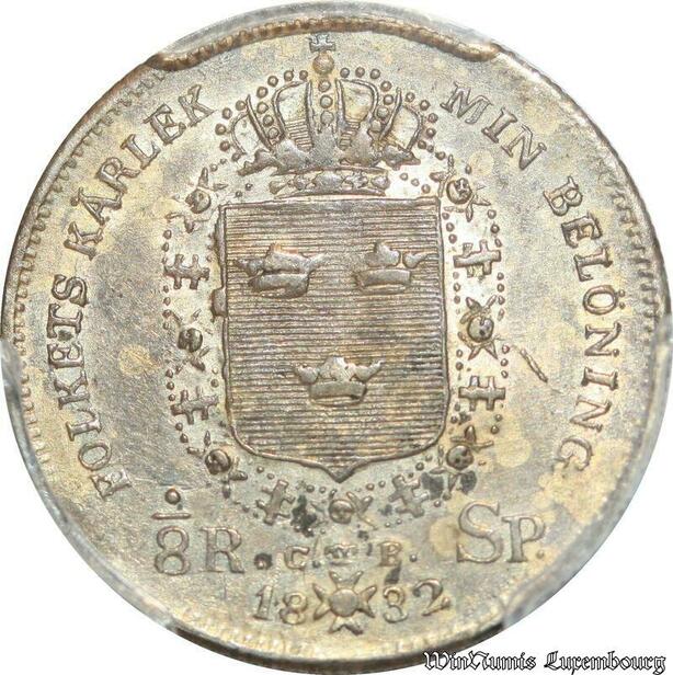 S7948 Rare Sweden 1/8 Riksdaler Carl XIV 1832 CB PCGS AU58 Silver