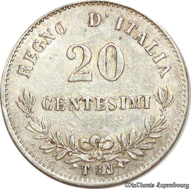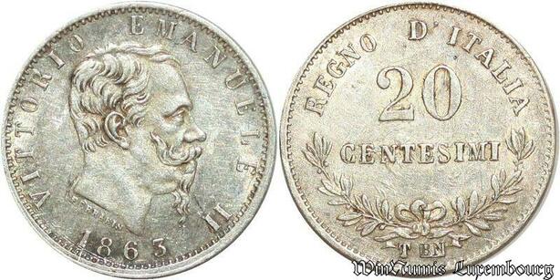 S2010 Rare Italy 20 Centesimi Vittorio Emanuelle 1863 Torino SUP AU ! MS !