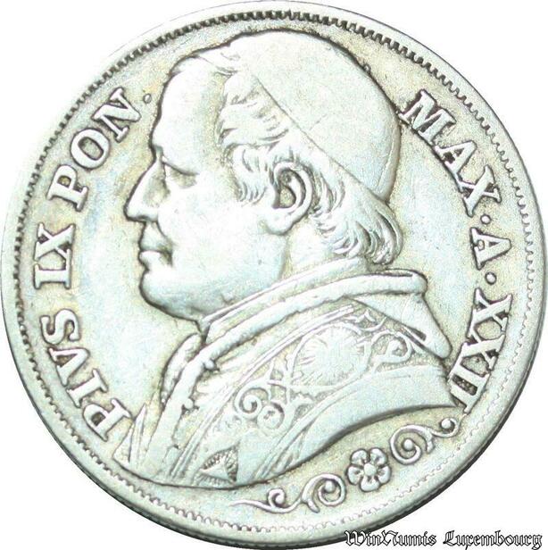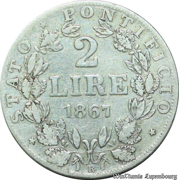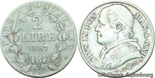 S2128 Papal States Vatican 2 Lire Pius IX 1867 R An XXII Argent Silver ->Faire Offre