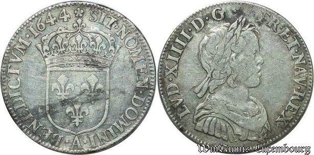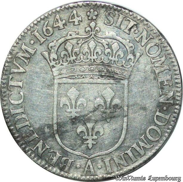 S2346 Rare France 1/4 Ecu Louis XIV Mèche Courte 1644 A Paris Rose Argent