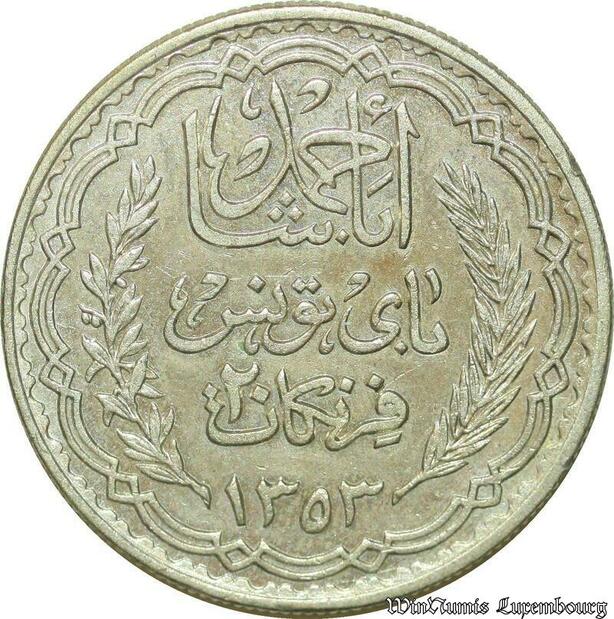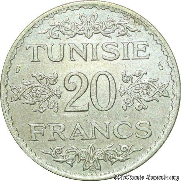 S359 Tunisie Protectorat Francais 20 Francs Ahmed II 1934 Argent SUP