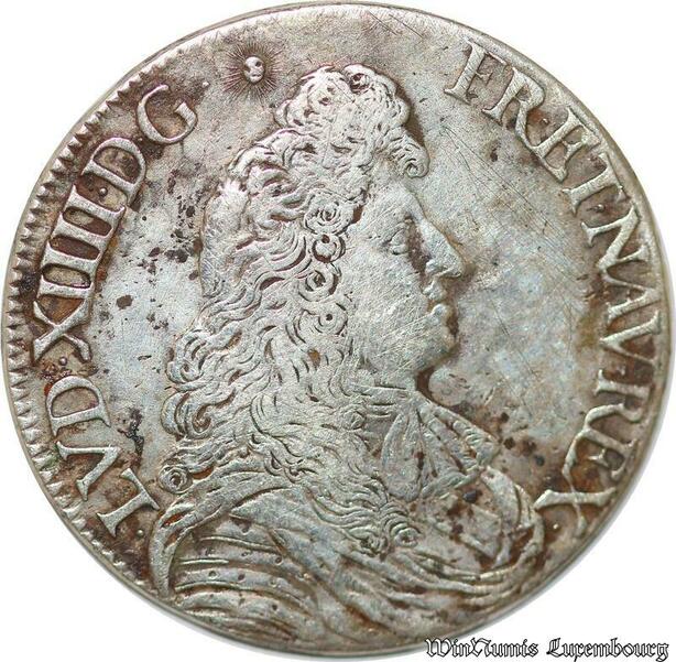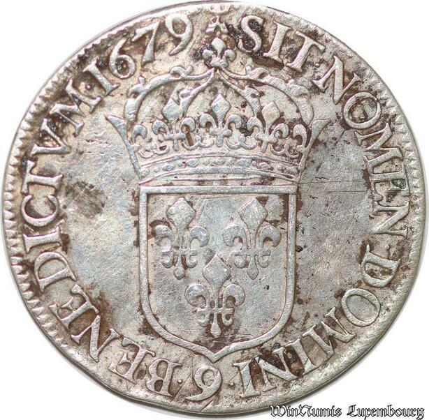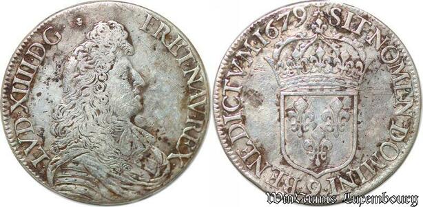 S652 France Très Rare Ecu Louis XIV cravate 1679 9 Rennes Magnifique portrait Argent