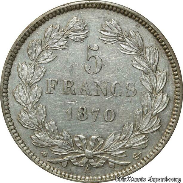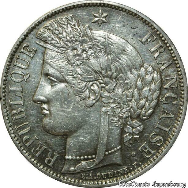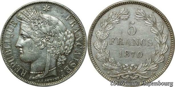 S687 France Très Rare 5 Francs Cérès 1870 Paris sans leg. Silver Superbe ++++
