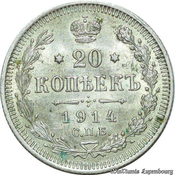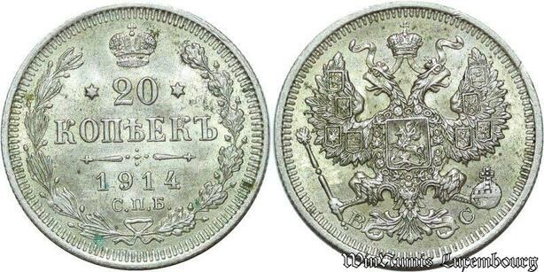 S1967 Russia Nicholas II 20 Kopecks 1914 BC Silver AUNC ->Make offer