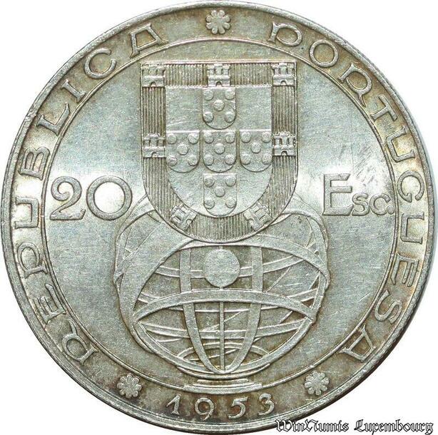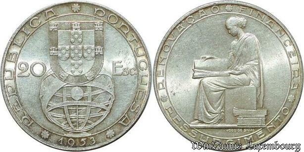 S1973 Portugal 20 Escudos Renovacão Financeira 1953 Argent Silver FDC