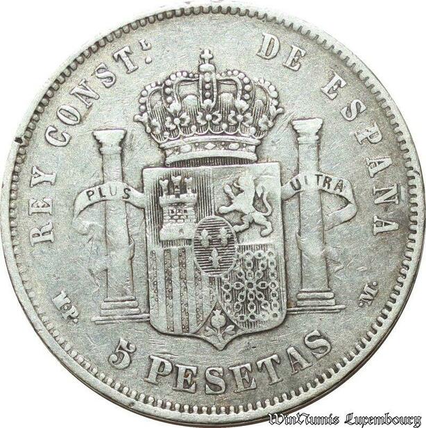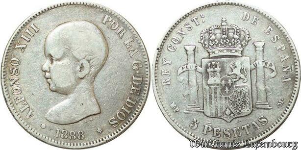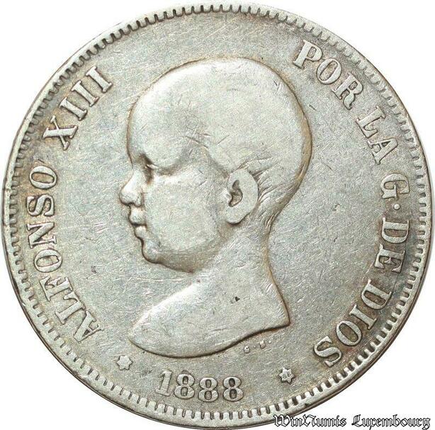S1988 Espagne 5 Pesetas Alphonse XIII 1888 Gregorio Sellan Argent