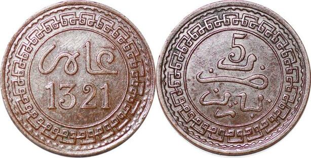 P0350 Morocco 5 Mazunas Abd Aiaziz AH 1321 1903 Paris -> Make offer