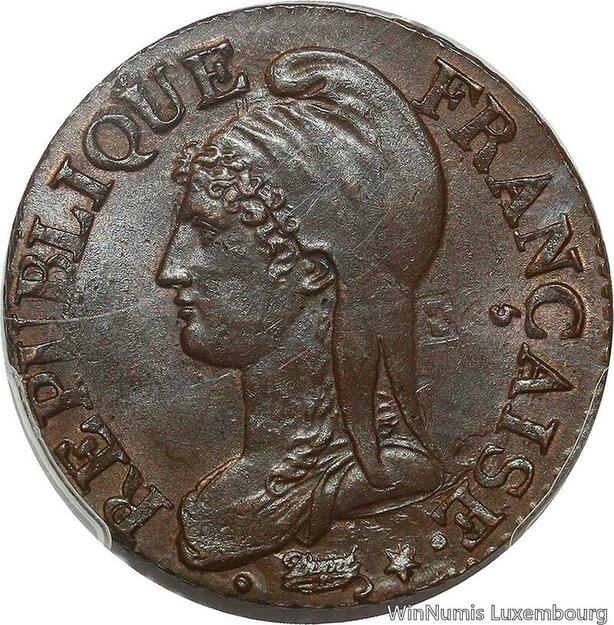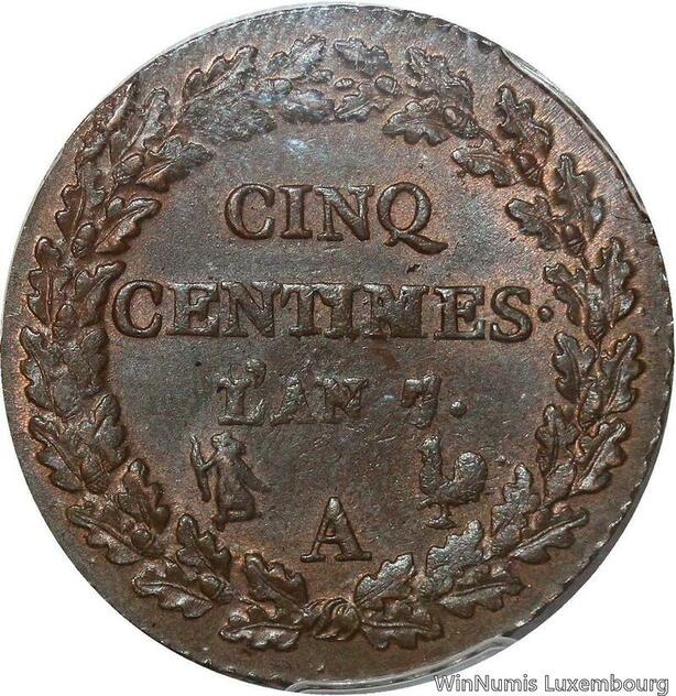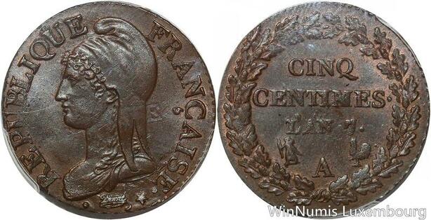 P0437 Unique 5 Centimes Dupré refrappage decime AN 7/5 A PCGS MS64 SPL+