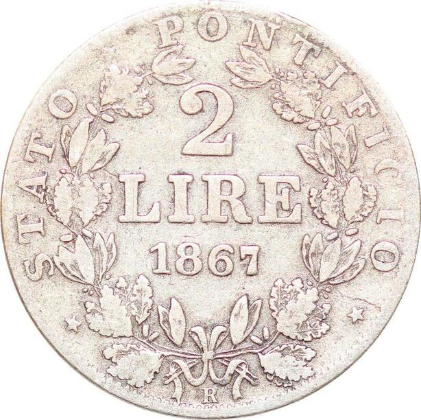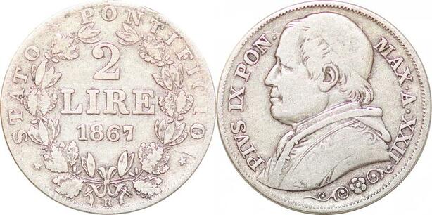 P0569 Papal States Vatican 2 Lire Pius IX 1867 XXII R Roma Silver