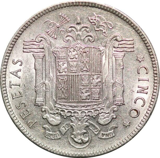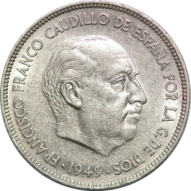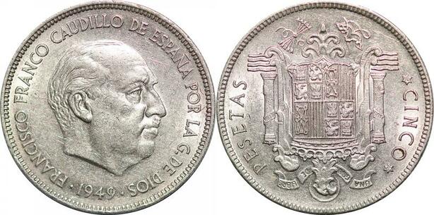 P0595 Spain 5 Pesetas Franco 1949 Stars 1950 AU ->Make offer
