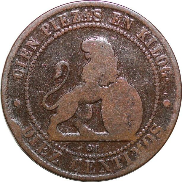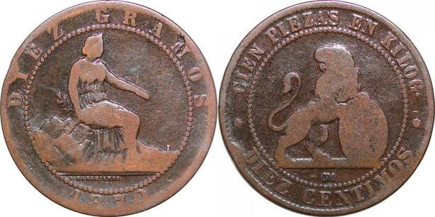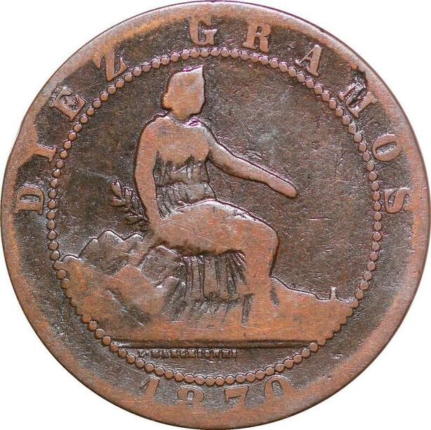 P0607 Spain 10 Centimos Granos 1870 OM ->Make offer