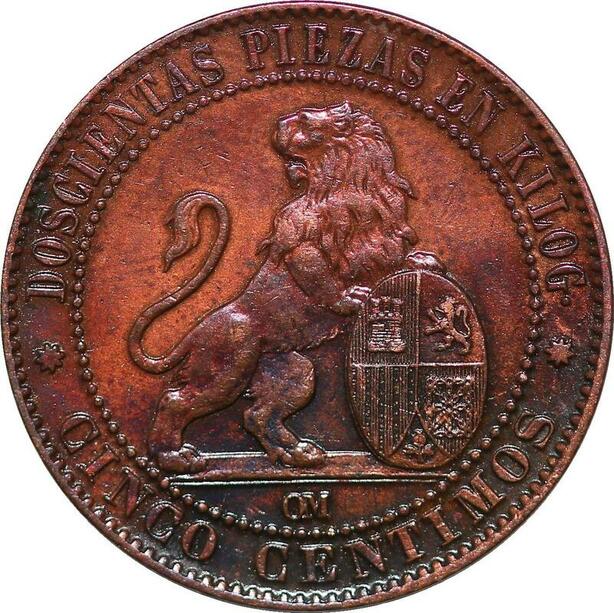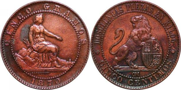 P0616 Spain 5 Centimos Provisoire Isabel II 1870 Barcelona OM AU ->Make offer