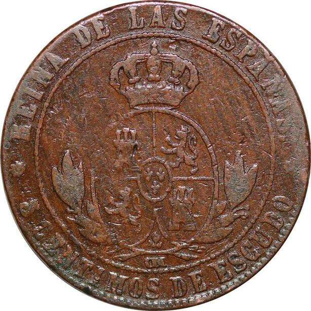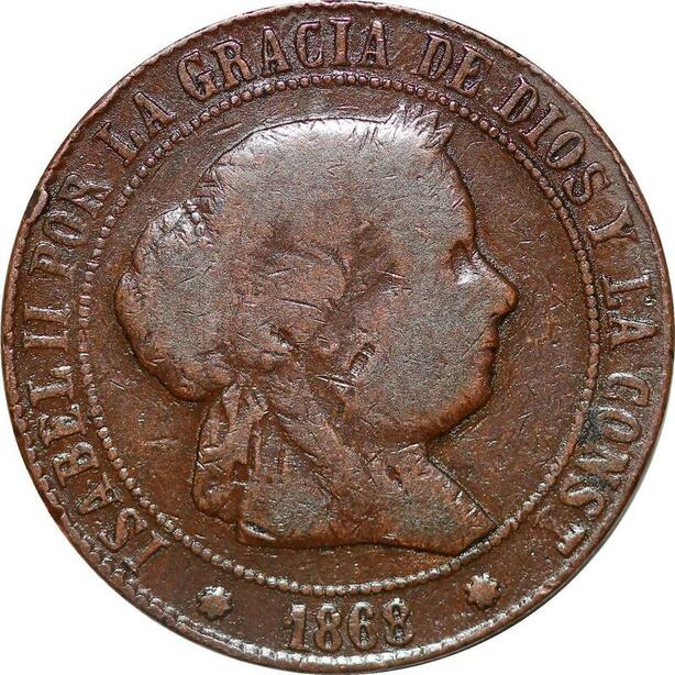 P0617 Spain 5 Centimos de Escudo Isabel II 1868 Barcelona O.M ->Make offer