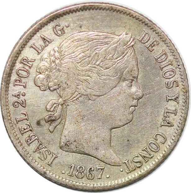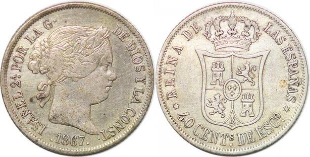 P0869 Spain 40 Centimos Escudo Isabel II 1867 Madrid Silver XF+ -> Make offer