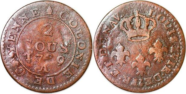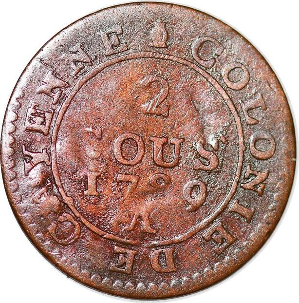P1042 Guyane French Colonies 2 Sous Louis XV Cayenne 1789 A Paris Fab Locale