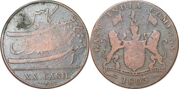 P1392 India British Madras Presidency 20 Cash 1803 -> Faire offre