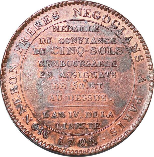 P1407 France Médaille 5 Sols Confiance Monneron Serment an IV 1792 TTB+ -> Faire offre