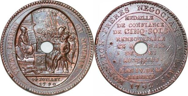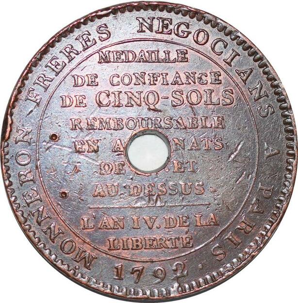 P1409 France Médaille 5 Sols Confiance Monneron Serment an IV 1792 TTB -> Faire offre