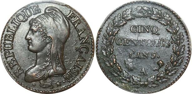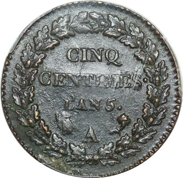 P2271 Rare France 5 Centimes Dupré AN 5 A Paris PCGS AU Superbe -> Faire Offre