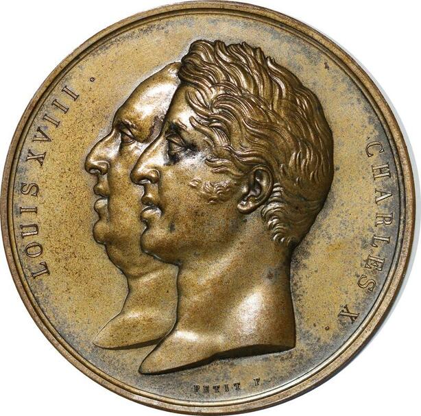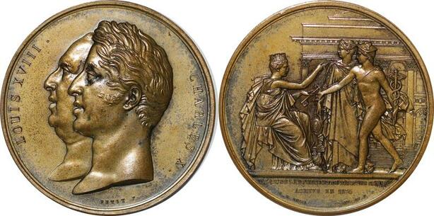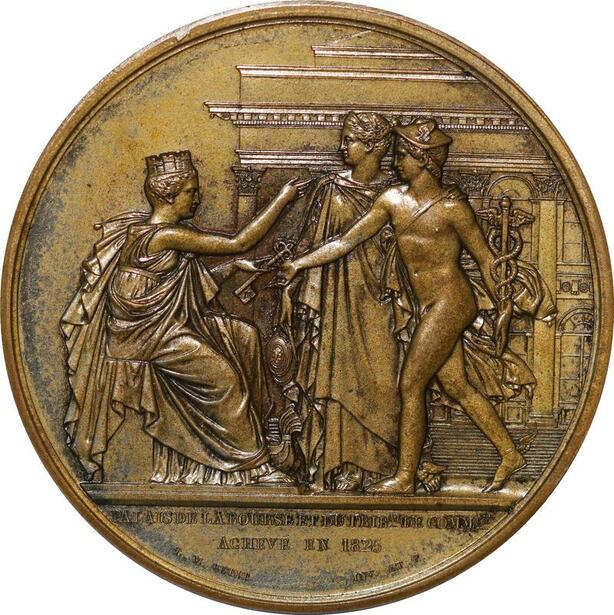 P2520 Rare France Médaille Louis XVIII Charles X Palais Bourse 1825 Desnoyers SUP