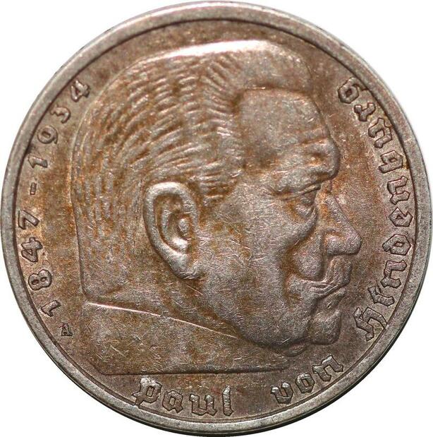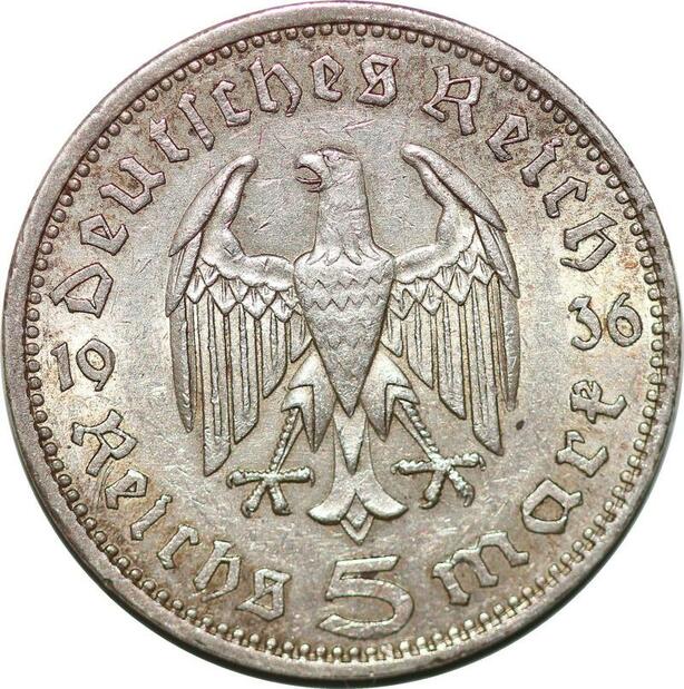 P3095 Germany Third Reich 5 Reichsmark Swastika Hindenburg 1936 A Silver