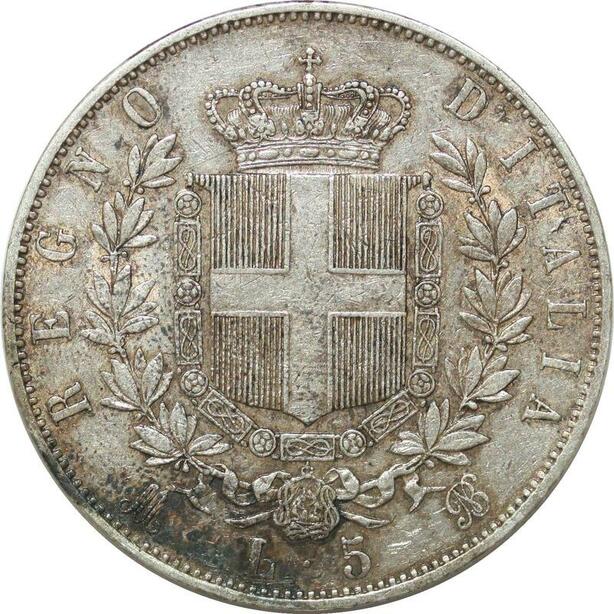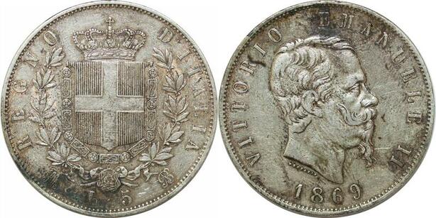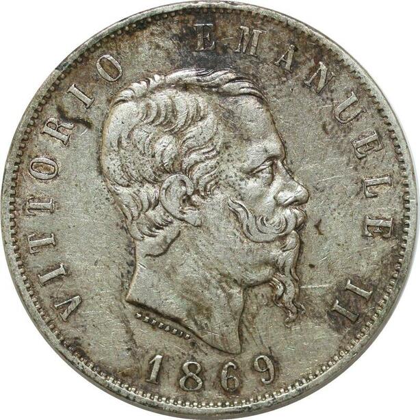 P3387 Scarce Italy 5 Lire Vittorio Emanuele II 1869 M Milan BN Silver