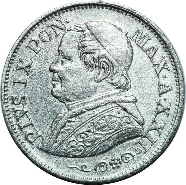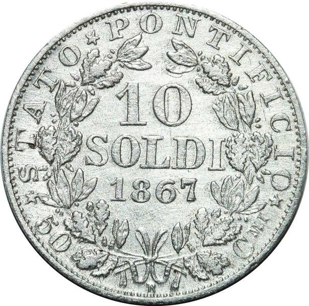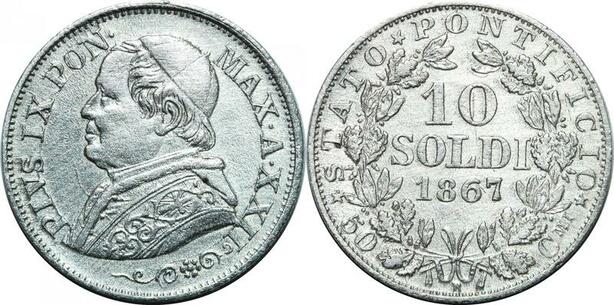 P3466 Vatican 10 Soldi Pius IX 1867 Anno XXII R Roma Silver ->M offer