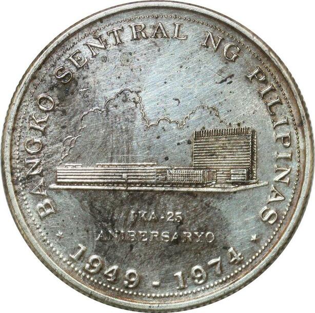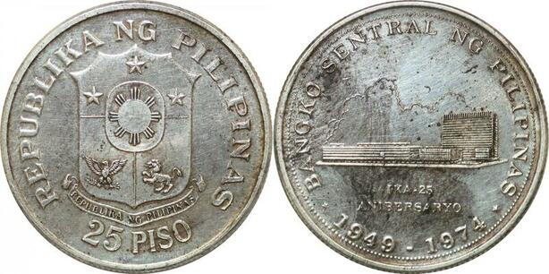 P3526 Phillippines 25 Piso 25th Anniversary of Bank 1949 1974 Silver
