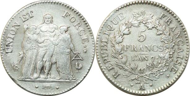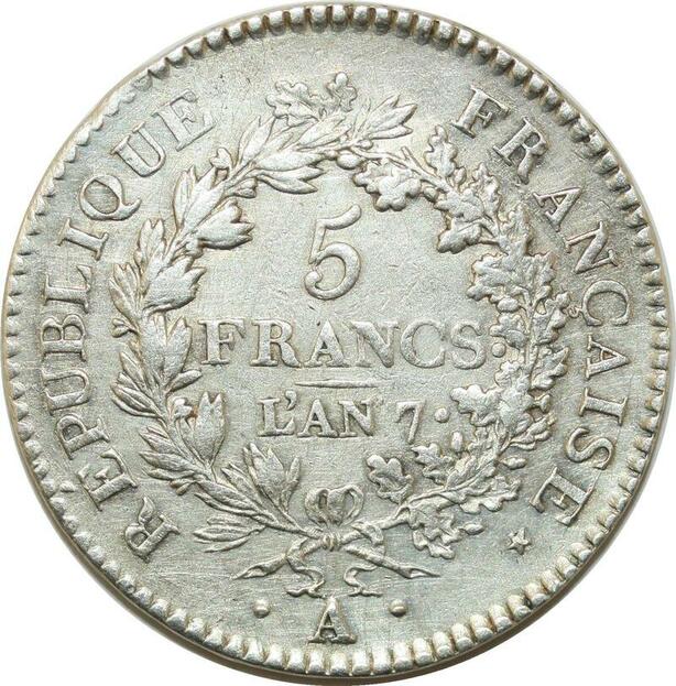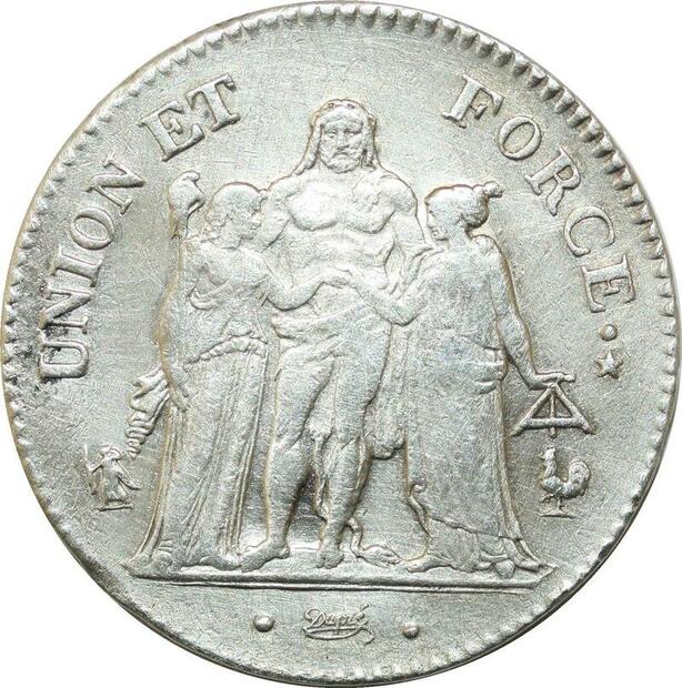 P3665 Rare France 5 Francs Union et Force 1799 an 7 Var. Grand / Petit A Paris