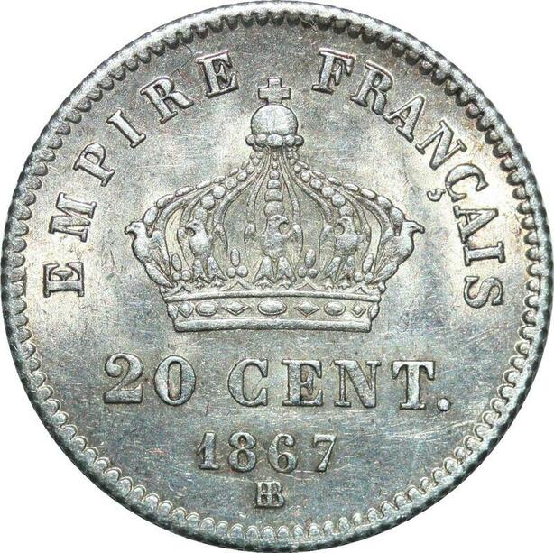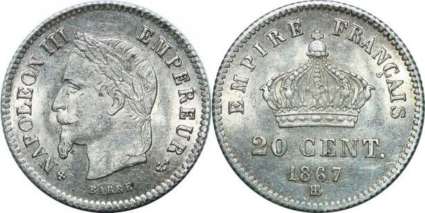 P3959 France 20 Centimes Napoléon III 1867 BB Strasbourg Argent SPL -> Faire offre