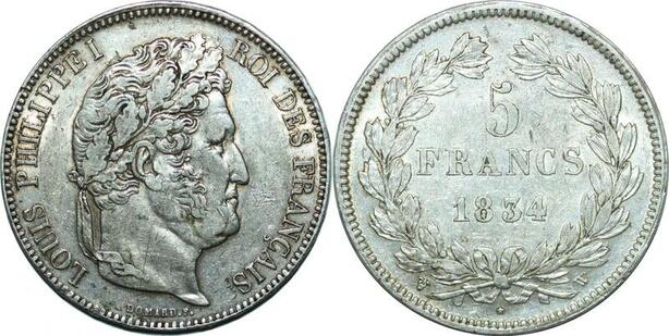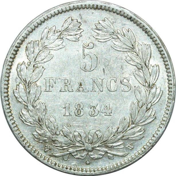 P4008 Rare France 5 Francs Louis Philippe type Domard 1834 W Lille Argent ->Faire offre