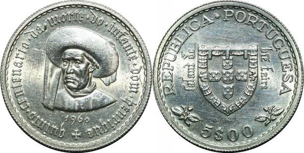P4219 Portugal 5 Escudos 1960 Heinrich Dom Henrique Silver AU -> M offer