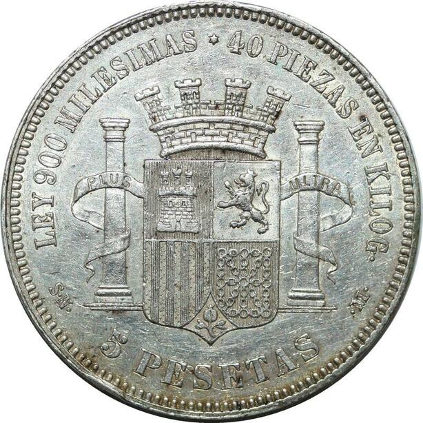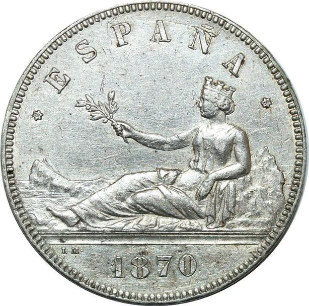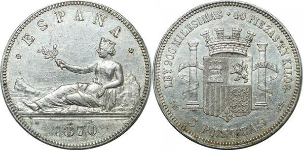 P4258 Scarce Spain 5 Pesetas 1870 (70) SD M Madrid Silver AU ->Make offer