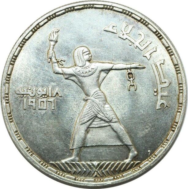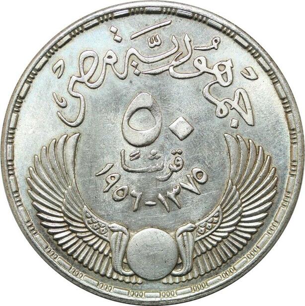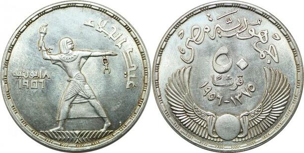 P4559 Egypt 50 Piastres Evacuation British AH 1375 1956 Silver AU UNC