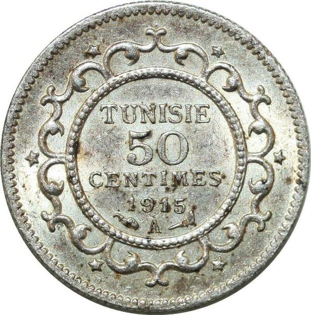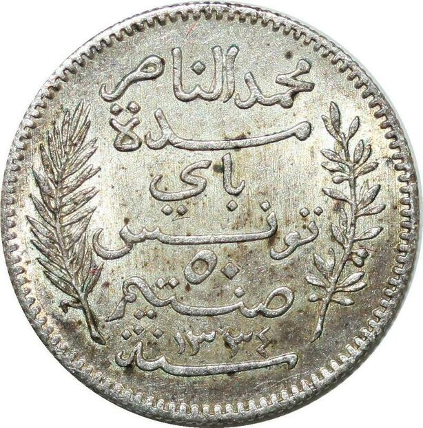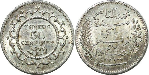 P4599 Tunisia 50 centimes Mohamed En-Naceur AH 1334 1915 A Paris Silver UNC