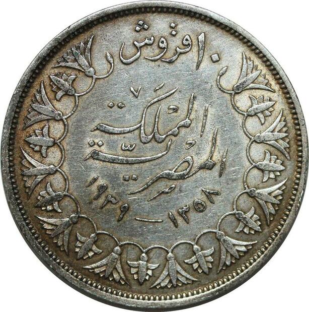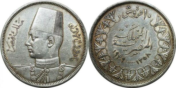 P4615 Egypt 10 Piastres Farouk AH 1358 1939 Silver AU -> Make offer