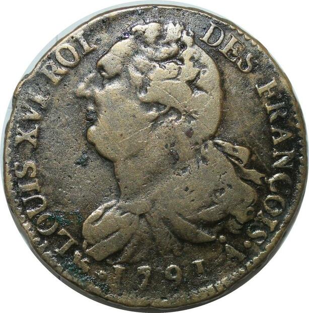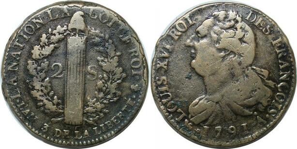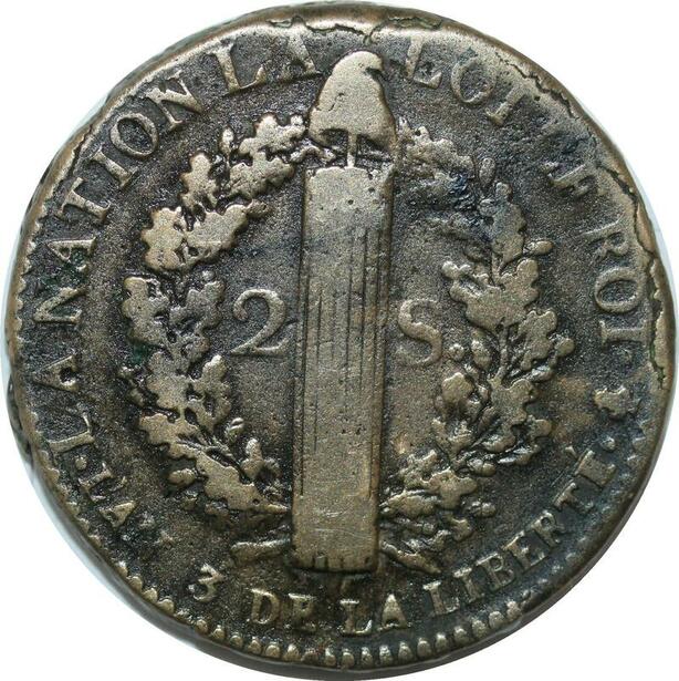 P4622 Rare France 2 Sols faisceau Louis XVI Francois 1791 A Couvent barnabites an 3