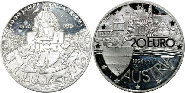 P5553 Austria 20 Euros 1000 Jahre Ostarrich 1996 Silver Proof-> M Offer