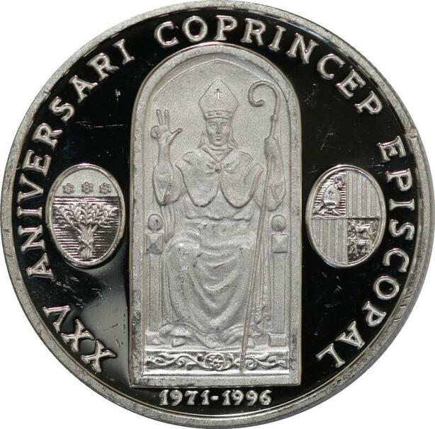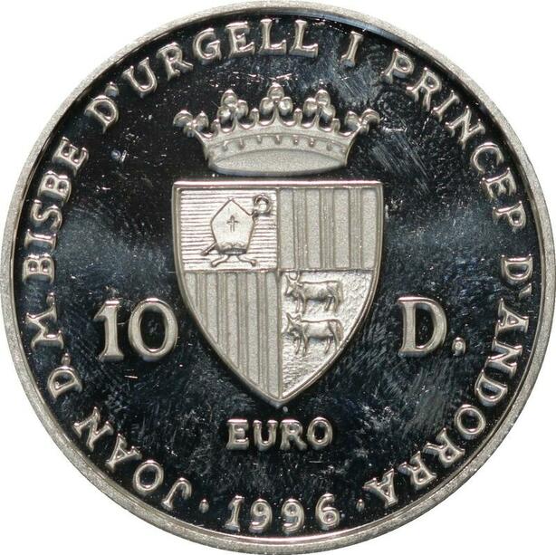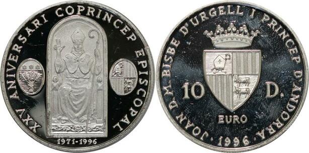P5571 Andorra 10 Diners Euro Aniversary Coprincep Episcopal 1996 Silver Proof