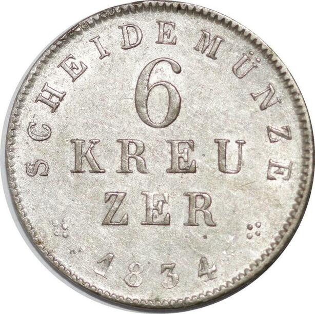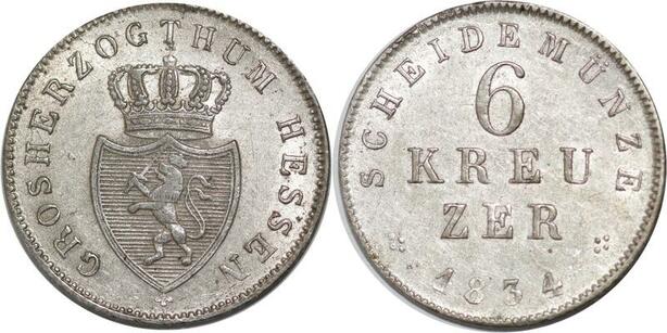 P5784 Germany Hesse Darmstadt 6 Kreuzer Ludwig II 1834 Silver AU -> M Offer