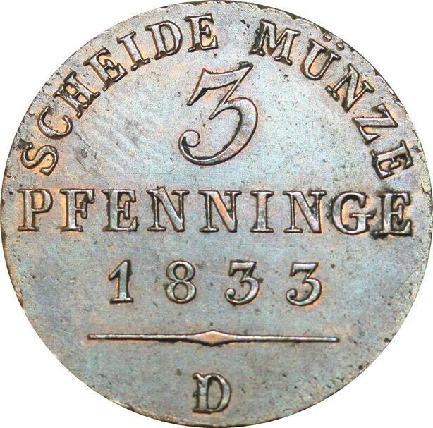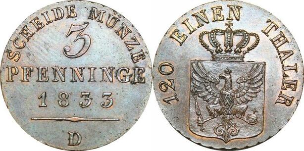 P5847 Rare Germany 3 Pfenninge Friedrich Wilhelm III 1833 D UNC !!! BU